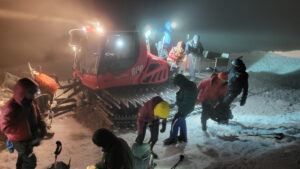 Na wysokości 5100 m mieliśmy zaczekać na ratrak z drugą grupą, ale wiatr zbyt daje się nam we znaki. Tamtej grupie również towarzyszą przewodnicy, więc nie ma powodu, by się o nich martwić. A przy tych warunkach łatwo o błąd, bo wiatr nie daje zbyt dużego marginesu.