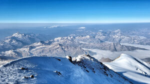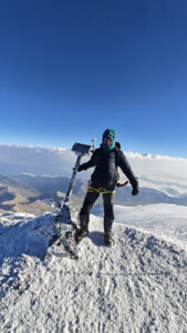 Docieramy do plateau pomiędzy dwoma wierzchołkami Elbrusa, a następnie do podejścia zabezpieczonego poręczówkami. Powyżej niech jest wypłaszczenie prowadzące do „cycka”, który jest zwieńczeniem naszej drogi i najwyższym punktem Kaukazu. Wejście na stożek na szczycie kosztuje nas mnóstwo sił i wymaga samozaparcia, ponieważ wiatr w tym miejscu wręcz zatrzymuje w miejscu. Po pierwszych próbach pochylam się mocno do przodu, odruchowo zaciskam pięści i siłą wydzieram górze te ostatnie metry. Nareszcie jest – Elbrus 5642 m n.p.m. – zdobyty. Jest godzina 8-ma rano, a zatem te 1500 metrów w pionie przeszliśmy w 9,5 godziny.