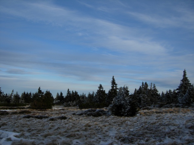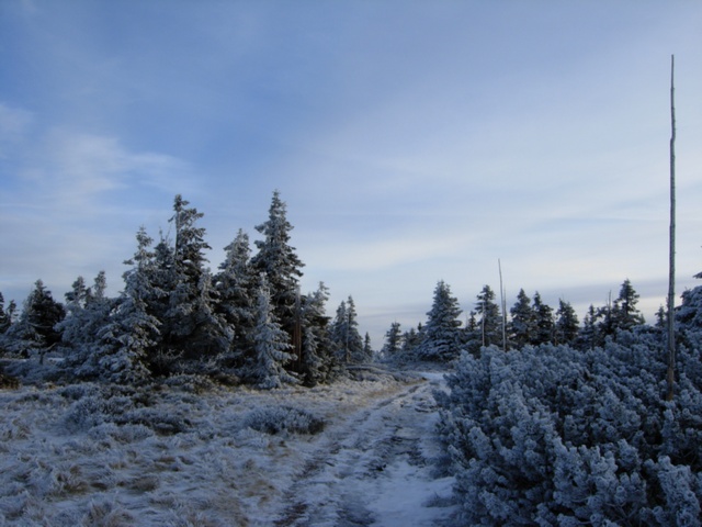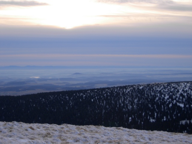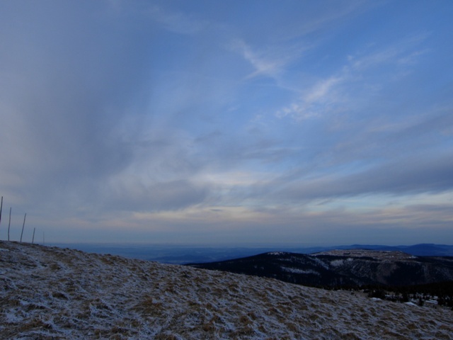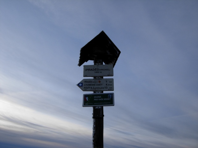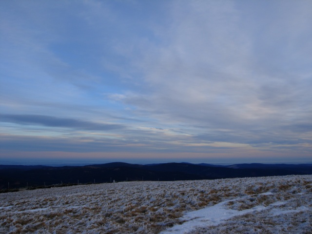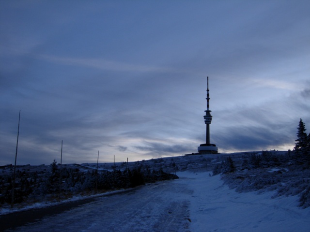 Czas: 27.12, niedziela, godz. 5:05. Miejsce: łóżko, Nysa. Pobudka, śniadanie, drapanie szyb, i około 5:40 ruszam w drogę, na południe. Przed 7-mą dojeżdżam na parking w miejscu nazwanym Sedlo - Videlsky Kriz. Dzisiaj w planie 3 góry w 3 różnych pasmach Sudetów. Biorąc pod uwagę, że najpóźniej o 18-tej chcę być we Wrocławiu, to czasu mam bardzo niewiele. Dodatkowo nigdy wcześniej nie byłem w tych czeskich górach. Dlatego na dzisiaj wybieram trasy wg mnie najkrótsze, ale i tak kiedy się zaczynam zastanawiać i liczyć to nijak nie wychodzi, żeby dało się to zrobić w tak krótkim czasie. Zatem zamiast się zastanawiać, po prostu łapię za kijki i o 6:57 startuję na Pradziada. Do pokonania 5,5 km pod górę. Po 1h 20' marszu, krótko po wschodzie słońca stoję na 1492 m npm, na szczycie z wieżą RTV. Okazuje się, że na każdej z gór, które wybrałem na dziś, znajdują się wieże z nadajnikami. Ale Kekes...